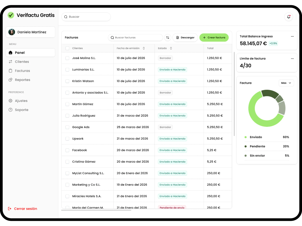 - Gestión Simplificada: Crea, organiza y envía facturas en segundos, ahorrando tiempo y evitando posibles sanciones.