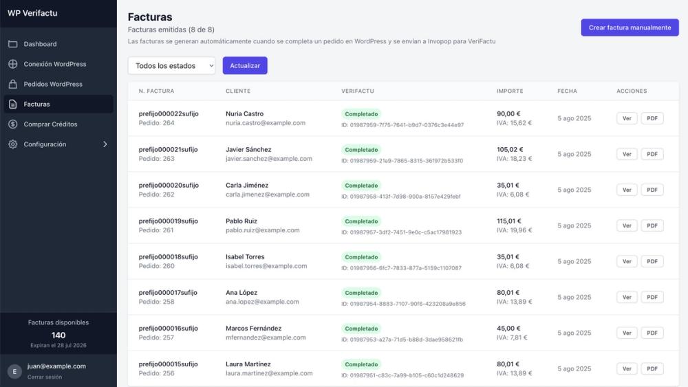 - Descarga de facturas en PDF: Accede a las facturas desde WordPress o la plataforma.